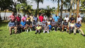 The Arcadia harmony Team pauses with the men at the men’s mentorship and empowerment group teambuilding event, held at the Tropical resort, Ruiru Dam